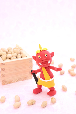 節分が近くなると、でん六豆に鬼のお面が付録でついて売られていて、子供がいる家庭にはたいてい用意してあり、おじいさんやお父さんが鬼役となり子供に豆を投げつけられる…。本来は家長が豆をまいて鬼を退治するものだったそうですが。