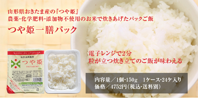 農薬不使用のおきたま興農舎の契約栽培つや姫を使用しています。こだわりのお米がレンジ2分で粒の立った炊き立てご飯に!