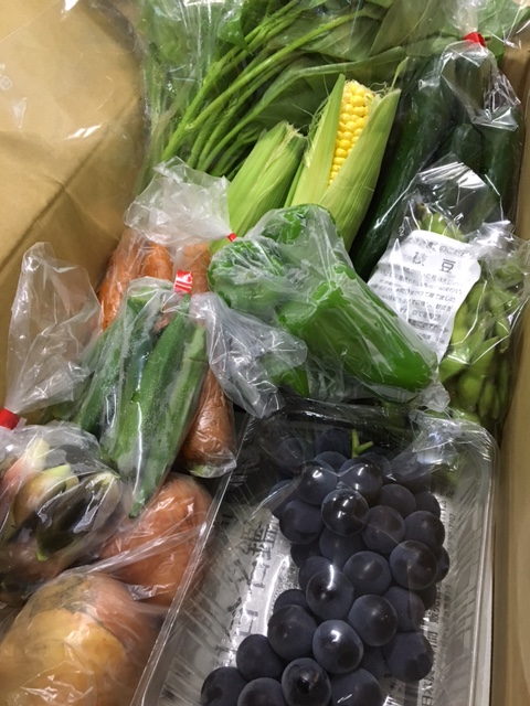 玉ねぎ、人参、水菜、枝豆、トウモロコシ、きゅうり、ピーマン、空芯菜、みょうが又はししとう又はいんげん、おくら、キャンベルス(ぶどう)