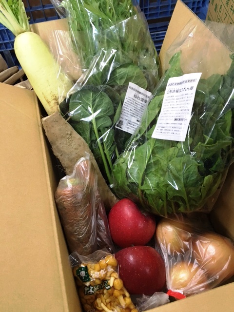 玉ねぎ、人参、大根、長芋又はさつまいも、山形赤根ホウレン草、水菜、仙台雪菜、なめこ、りんご(ふじ)