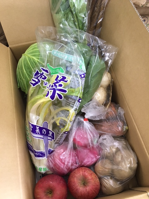 じゃがいも、人参、キャベツ、小松菜、小かぶ、雪菜、ごぼう、赤かぶ漬け、りんご(ふじ)