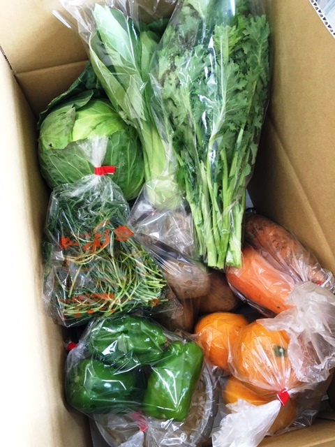 じゃがいも、人参、キャベツ、チンゲン菜、ちりめん五月菜、ピーマン、おかひじき、清見オレンジ 他