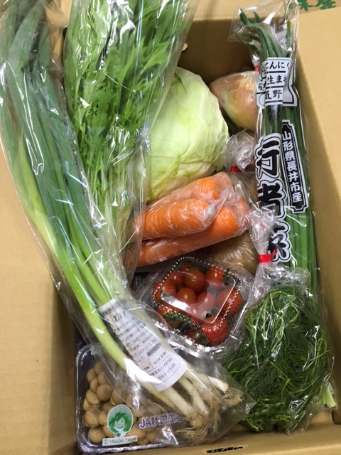 じゃがいも、玉ねぎ、人参、キャベツ、水菜、行者菜、葉ねぎ、おかひじき、しめじ、ミニトマト、