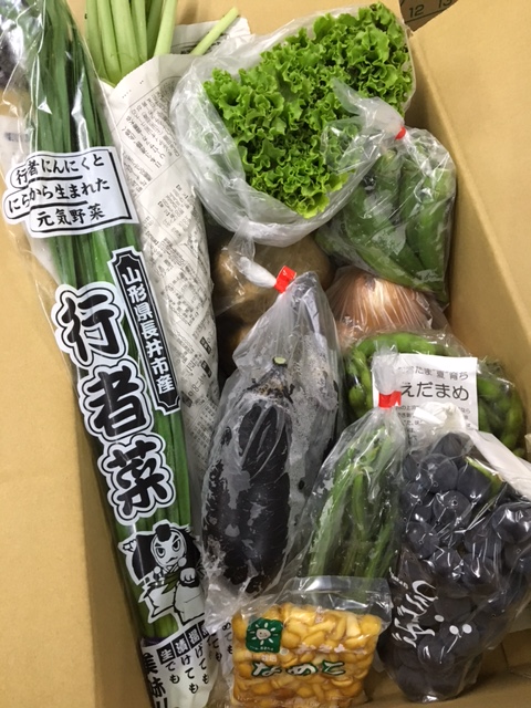 玉ねぎ、じゃがいも、大根、グリーンリーフ、枝豆、長茄子、いんげん、行者菜、なめこ、オクラ又はみょうが、キャンベルス(ぶどう)