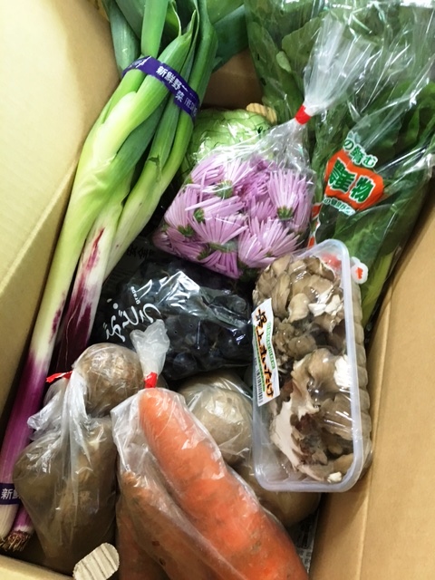 じゃがいも、人参、レタス、里芋、仙台雪菜 小松菜、赤ねぎ、食用菊(もってのほか)、舞茸、ベリーA
