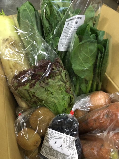 たまねぎ、にんじん、大根、サニーレタス、ホウレン草、茎立菜、小松菜、水菜、雁食い豆(黒豆)、キウイ