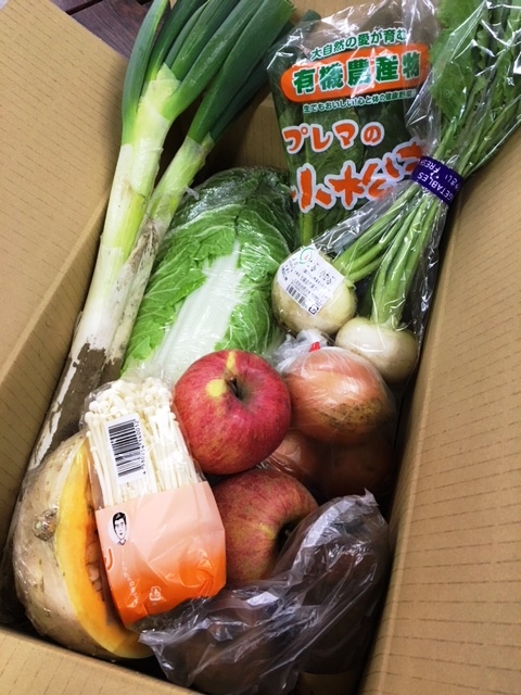 玉ねぎ、人参、白菜、長ねぎ、小松菜、小かぶ、白皮かぼちゃ、えのき茸、りんご(ふじ)