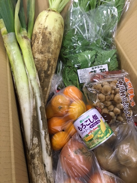 玉ねぎ、じゃがいも、大根、菜花、水菜、長ねぎ、しめじ、とうもろこし缶、みかん