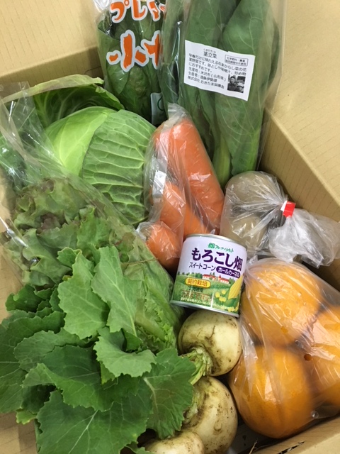人参、じゃがいも、キャベツ、サニーレタス、小松菜、小かぶ、茎立菜、コーン缶、はっさく