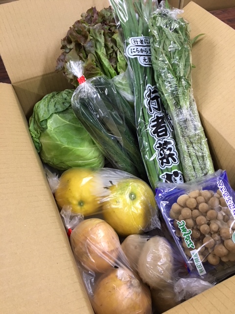 じゃがいも、新玉ねぎ、キャベツ、サニーレタス、行者菜、きゅうり、あざみ、しめじ、河内晩柑