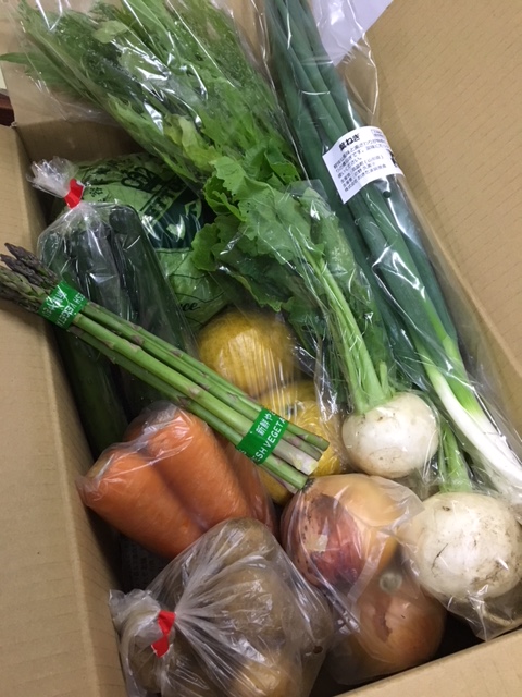 玉ねぎ、人参、レタス、水菜、サラダかぶ、きゅうり、葉ねぎ、アスパラガス、樹なり甘夏、ミニじゃが(サービス品)