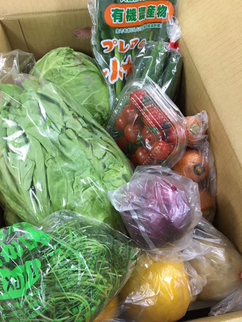 じゃがいも、人参、赤玉ねぎ、キャベツ、グリーンリーフ、きゅうり、小松菜、おかひじき、ミニトマト、樹なり甘夏