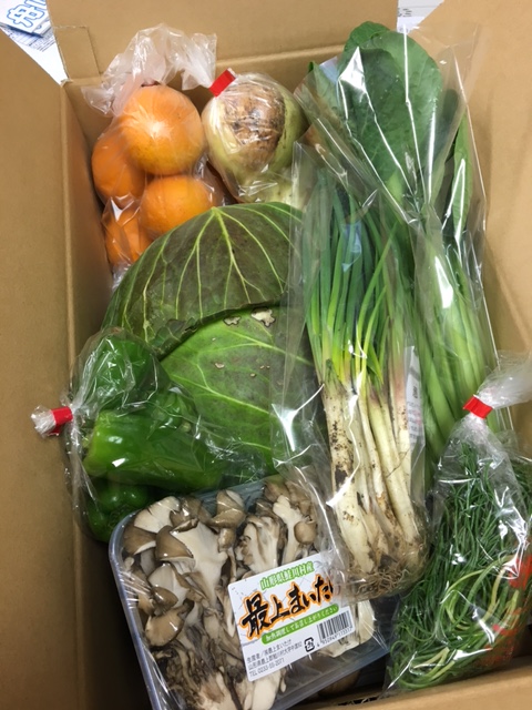 じゃがいも、玉ねぎ、キャベツ、ピーマン、おかひじき、あさつき、小松菜、ちりめん五月菜、舞茸、清見オレンジ