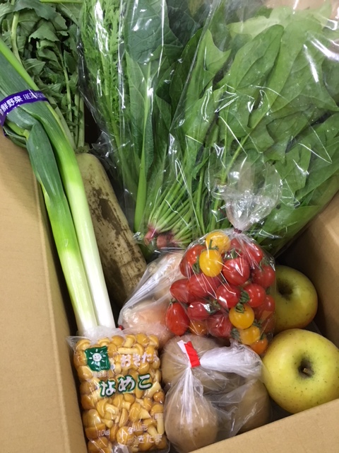 じゃがいも、玉ねぎ、大根、赤根ほうれん草、小松菜、わさび菜又はチンゲン菜、ねぎ、なめこ、ミニトマトMIX、りんご(ぐんま名月)2個