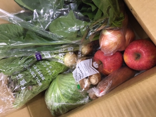 人参、玉ねぎ、キャベツ、山形赤根ほうれん草、茎立菜、サニーレタス、小かぶ、ブラウンマッシュルーム、りんご(ふじ)2個