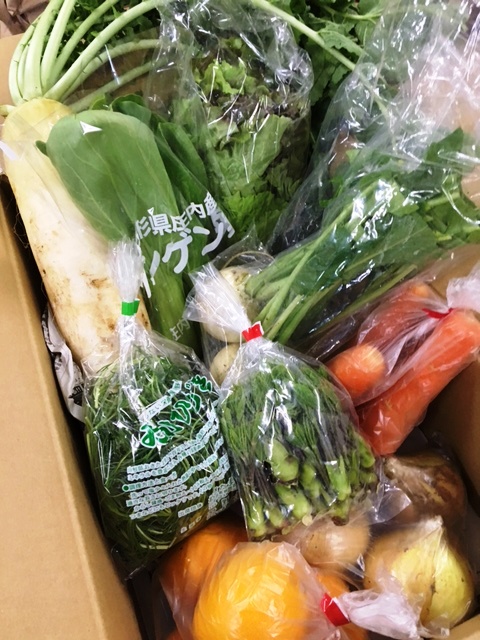 新玉ねぎ、人参、大根、サニーレタス、小かぶ、チンゲン菜、おかひじき、こしあぶら、清見オレンジ