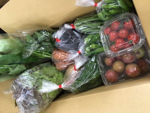 ニンジン、じゃがいも、きゅうり又はサニーレタス、おかひじき、長茄子、空芯菜、モロヘイヤ又はつるむらさき、インゲン、ミニトマト、オクラ、ししとう又はピーマン又はみょうが、すもも(ハニーハート)
