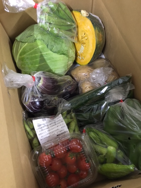 じゃがいも、キャベツ、かぼちゃ、枝豆、ピーマン、オクラ、きゅうり、みょうが又はししとう、長茄子、ミニトマト